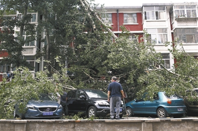 前晚9时,海淀区复兴路24号院内,一排30年左右树龄的杨树,在风雨中一株接一株地倒下,树下停着的15辆私家车均遭了砸。