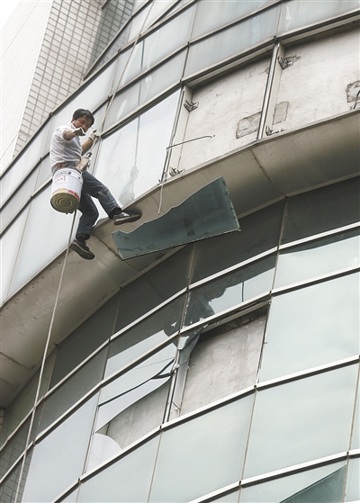 昨天下午1时,在事发现场,恩菲物业的两名工作人员正在20多米高的楼上,清理未完全掉落的玻璃。#p#分页标题#e#