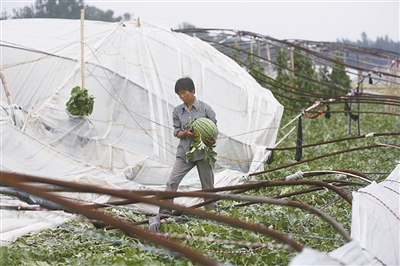 榆垡镇新桥村的瓜农,在损坏的瓜棚里清理西瓜。