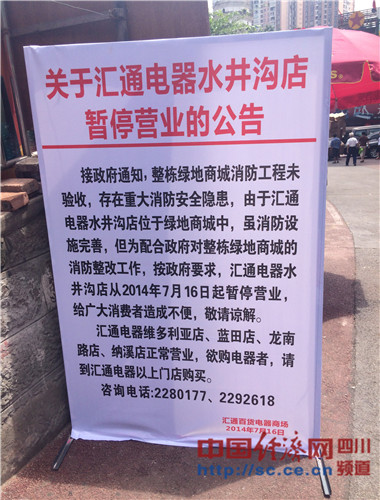 中国经济网泸州7月16日讯(曾小龙)今(16)日 接到政府通知,位于泸州市江阳区水井沟报恩塔旁的绿地商城,因整栋商城消防工程未验收,存在重大消防安全隐患,由于汇通电器水井沟店位于绿地商城中,虽消防设施完善,但为配合政府对整栋绿地商城的消防整改工作,按政府要求,汇通电器水井沟店从2014年7月16日暂停营业,配合绿地商城进行为期4个月的整改工作,并在当地媒体发布暂停营业公告。