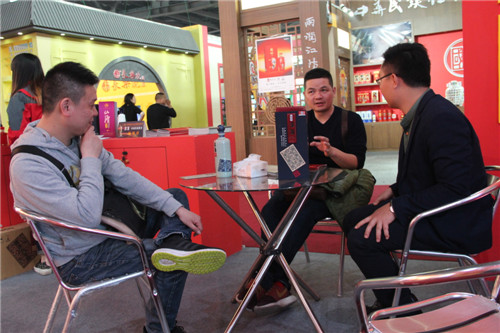 潭酒董事长方久伦(右一)亲临展厅与客商愉快洽谈