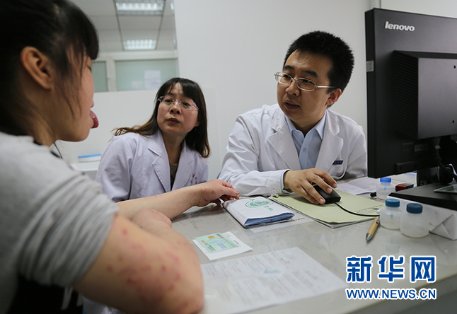 北京中医医院皮肤科副主任、主任医师张苍(右一)为银屑病患者检查舌苔 新华网 袁馨晨 摄