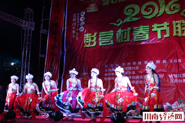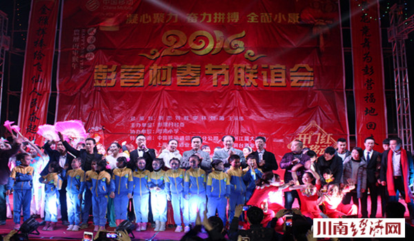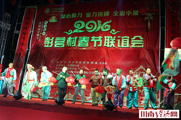 2016猴年彭营村春节联谊会是丹桂镇彭营村农民举办的第一次迎新春文艺晚会,这次 2016猴年春晚内容丰富多彩,有舞蹈《红红的日子》《小苹果》、诗朗诵《彭营点赞》歌曲《故乡的云》《龙船调》、《民歌联唱》、小品《根除陋习》,还有民俗彩龙表演和花灯表演等近二十个节目。有古蔺“百灵鸟”之称的歌手周晓鸥给大家带来的一曲民歌风味的《龙船调》《四季花儿开》,优美的歌声赢得一片喝彩声。"毛主席"特型演员缪世璇、"周总理"特型演员罗永祥亲临助阵,为当地村民送”福“,“伟人”的光临,把晚会推向一个高潮,村民争相与“领袖们”合影留念。 据了解,缪世璇先生系宜宾市江安县人,曾是一位中学语文教师。2010年借调到县竹都艺术团,长相酷似伟人毛泽东,多年来,他潜心研究毛泽东选集和诗词书法,通读老一辈无产阶级革命家的传记,逐步成长为全国著名的特型演员,长期活跃在艺术舞台上,向全国人民再现主席风采。