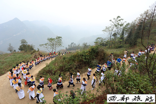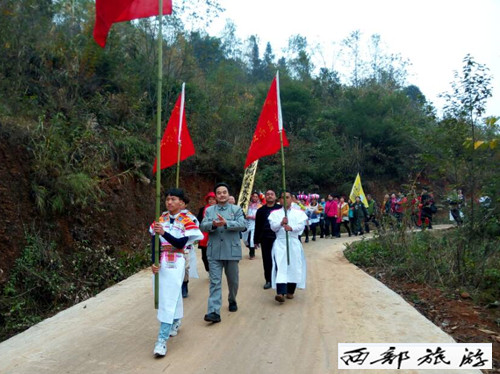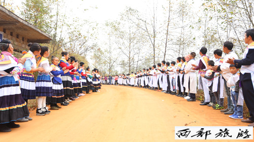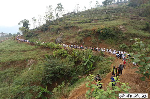 庆典现场还举行了旅游采风拍摄及民间民族文化展示活动。水城县米箩镇垭口组、荒田组全体人民群众3000余人参加活动。热情好客的苗族同胞身着盛装,整齐有序的长蛇阵队在五星红旗及“总理”的牵引下,盘旋于蜿蜒大道上,场面壮观,胜似精美,热闹非凡。