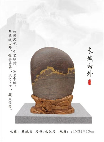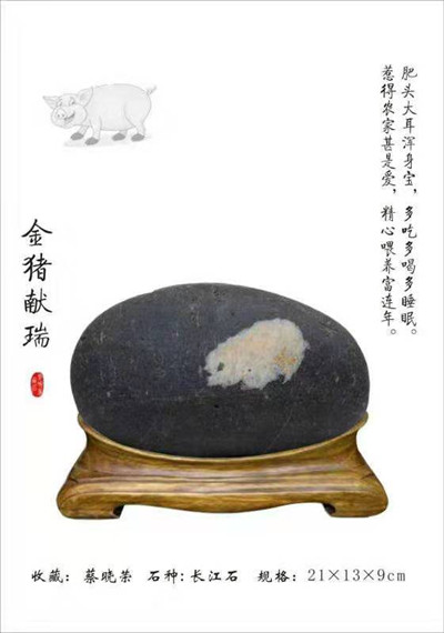 蔡晓荣先生系原解放军某部退役军人、四川省泸州市人民法院退休法官,现任泸州市盆景根艺协会秘书长。上世纪90年代初期,蔡晓荣对长江中的画面石产生浓厚兴趣,并与奇石结缘。经过二十多年的不懈努力,蔡晓荣收集的多枚长江奇石被赏石行家公认为“精品”,在参加的国际、国内奇石展中荣获金、银、铜奖多项,其特有的赏石理念得到了广大石界人士的肯定。在他看来,人活着就是为了心情,培养盆景、赏玩奇石、制作根雕、修练书法是因为我高兴,已成为我生命的一部分。如果一个人活得很压抑、很无奈,那是对生命的最大摧残。生长于长江岸边的蔡先生,热爱长江,收藏长江奇石是自己最大的乐趣。先后收藏长江奇石上百枚,奇石“金猪献瑞”与“长城内外”就是这些藏品中的精品。
