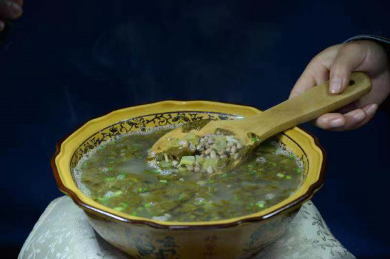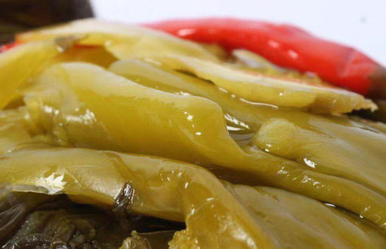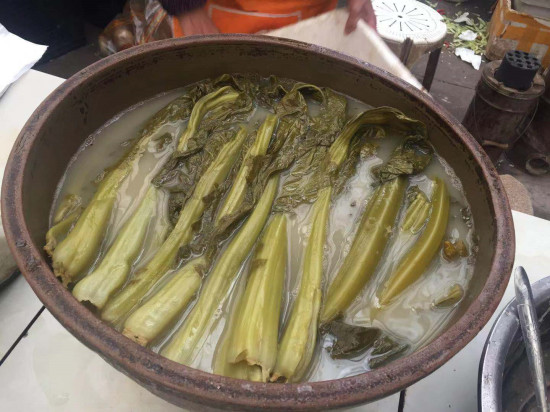 我与酸菜的缘分,当然不是来自唐诗宋词,而是始于外婆。大概是5岁左右一个深秋的下午吧,我依稀记得清冷的天空中有大雁排成人字形飞过,外婆拖拉出一个瓦缸清扫,说是要“捞酸菜了”,过了几天,就捞出了一瓦缸金黄的酸菜——人来到世间都有一个生命成长中回忆的起点,而我有明确的画面记忆,就是从那个时候开始的。特别要说的是,左邻右舍也这样。有用木桶的,有用瓦缸的,也有用石缸的。外婆说,我家的瓦缸是解放前外公置办来专门捞酸菜的。不知别人家的是不是这样上了年纪。但相同的是,每家大约都是从“草木摇落露为霜”开始,到来年春上“杂花生树,群莺乱飞”,几乎天天要请酸菜出来“讲课”。我后来因为端了《古蔺报》饭碗的关系,走遍了古蔺每个乡镇,无论是在乡场上,还是在农户家中,都吃过酸菜。所以,我就得出结论,没有喝过郞酒的人,不一定就不是古蔺人;但没有喝过酸菜汤的人,一定不是古蔺人。用我外婆的话说,酸菜接人待物笑眯眯的,不嫌贫爱富狗眼看人低,也不奴颜卑乞讨好贵人。与郞酒等其他几条好汉相比,酸菜老好,更和得人,所以,上自朝中命官,下自山中草民,都被他拉进了朋友圈。它既可以在农家火炉旁哼唱“茅屋为秋风所破歌”,也能在城里登大雅之堂演奏“春江花月夜”,简直就是农村包围城市的先进典范。不过,我更愿意把它当成一个成功的狩猎者,狡黠地看着芸芸众生掉进它设置的陷阱。