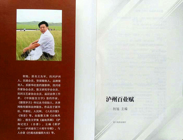 据介绍,初旭,本名王先军,系民建会员,新华社签约摄影师,四川省作家协会和四川散文学会会员。先后出版有《山地风流》、《遍地英雄》、《最泸州》、《追梦向太阳》等作品。《泸州百业赋》是他历经三年多时间收集整理并参与创作完成的又一部著作,值得单位、企业和私人收藏。