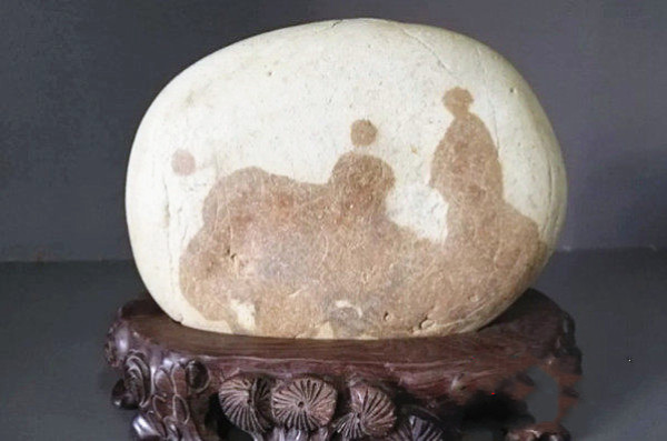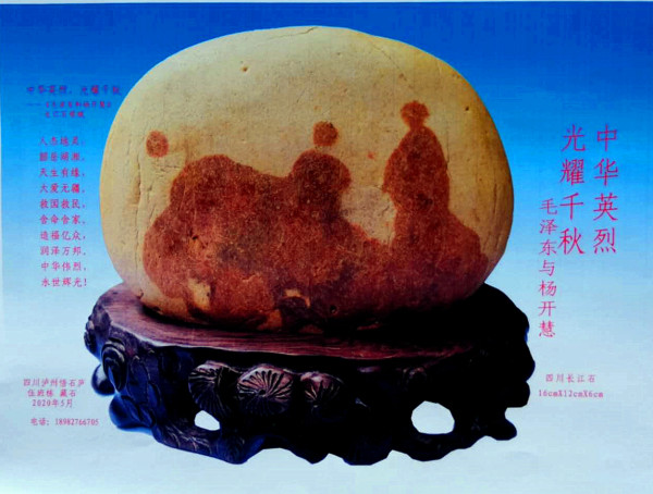 我从小喜好书画,收藏,尤喜好发现和收藏伟人,名人形象的各类奇石,二十多年来,收获颇丰。十年前,新中国六十华诞,我有幸在故乡泸州收藏到了《毛泽东》半身像长江石……十年后,不久前,又从网上淘宝,突然在泸州石友网上,发现和淘到了一枚情侣石。凭着我的直观感觉,发现石上的男女形象丰满,磅礴与柔情并存,酷似青年毛泽东与杨开慧。他们似乎正伫立在湘江河畔,橘子洲头……谈人生,谈理想,谈中国,谈世界!“问苍茫大地誰主沉浮?!”……百年前,他们喜结良缘,走进婚姻的殿堂。