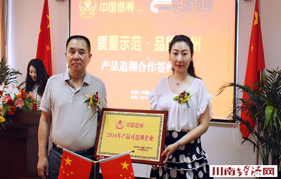 俗话说“多插立夏秧,谷子收满仓”,在这生机勃勃的红五月,双方怀着美好的祝愿,共同迎来了泸州市金源茂丰科技有限公司与四川长城电缆厂“企业入网‘中国追溯’服务协议的”签约仪式。在当天的签约仪式上,中国产品质量追溯系统网络平台四川运营中心主任兼泸州运营中心负责人、泸州市金源茂丰科技有限公司董事长林芝群女士,代表国家防伪工程技术研究中心产品追溯委员会向四川长城电缆厂董事长王向东先生颁发了“2016产品可追溯企业”金牌。签字仪式结束,现场嘉宾合影留念。