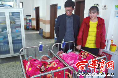 昨日,榆林市儿童医院,刘生霞夫妇在新生儿监护室内,看着并排躺在育婴床上的四个小宝宝华商报记者祁铭摄
