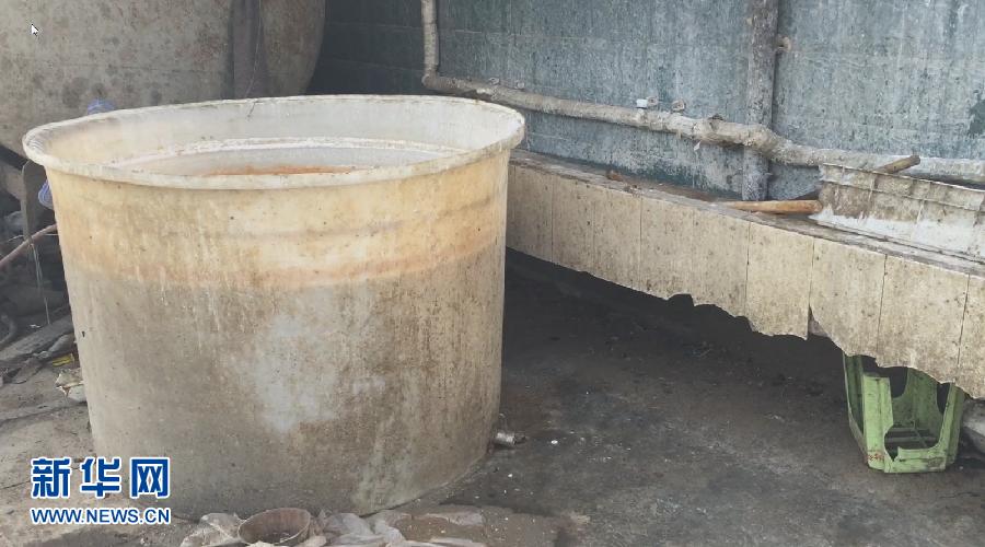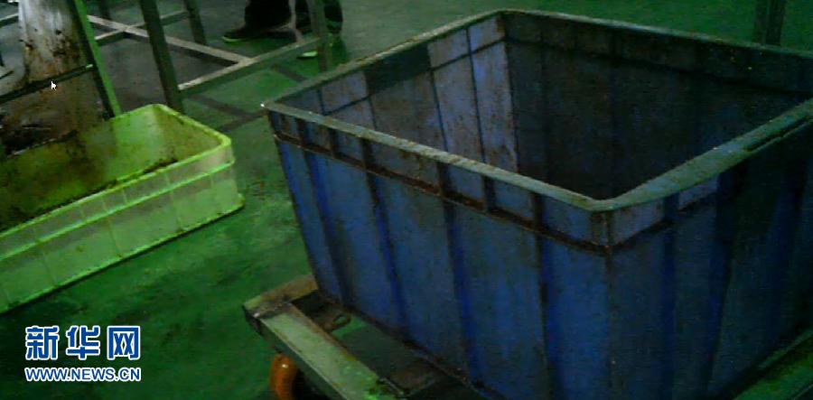 位于河南省通许县工业园的开封劲松食品有限公司生产厂房内,运送辣条的蓝色塑料箱上面布满黑色的污物和油渍(3月7日摄 视频截图)。