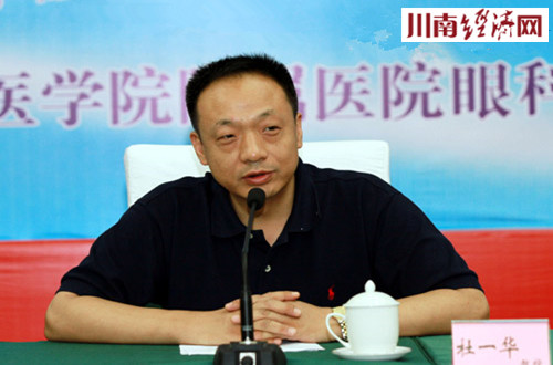 杜一华在会上作了题为《在新的历史时期,要有新常态,新视觉,团结一心,努力建成一流的学科、一流的医院》的发言,他表示:感谢广大干部职工、领导和组织的信任,学校今天的任命,使我感到担子更重、责任更大。未来的工作中我将在学校和省卫计委的领导下,团结班子和全院干部职工,齐心协力把医院各项工作推上一个新台阶。