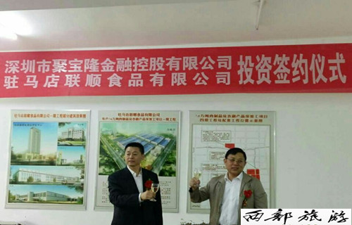 深圳市聚宝隆金融控股有限公司董事总经理徐贤科先生与河南驻马店联顺食品有限公司董事长阙卫刚先生在河南驻马店市成功签约。据介绍,