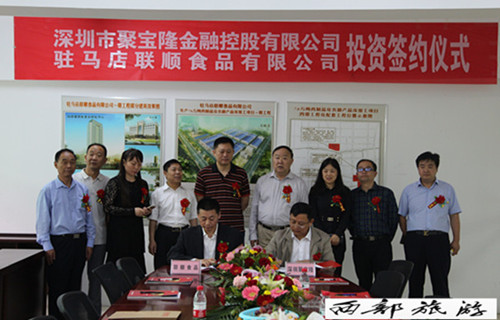 6月6日上午,深圳市聚宝隆金融控股有限公司与河南驻马店联顺食品有限公司成功签约,双方就驻马店年产76万吨肉制品等农副产品深加工项目进行战略合作,总投资为26亿元。