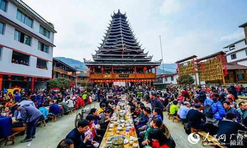 平等镇广南侗寨百家宴吸引众多游客体验侗家风情