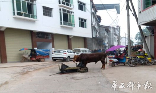 “当天是河沙镇的赶集日,集市上的行人很多。”据河沙镇派出所所长张凌云介绍,这头公牛跳下车后一路狂奔,从河沙镇的下街跑到了上街。路上的两名老大爷人和一名年迈的老太婆被公牛撞倒后受伤。“老太婆被牛踩了一脚,头部也被撞伤。”张凌云说,当地群众见到发飚公牛伤人后,立即打电话报警。