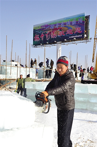 工人师傅在切割冰块