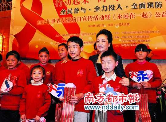 昨日,彭丽媛与参与公益短片《永远在一起》的青少年一起参加世界艾滋病日宣传活动。 新华社发