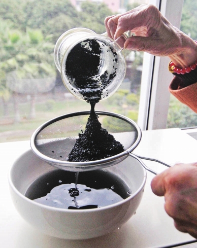 “平时买的黑芝麻过水后,水是褐色透明的,这回洗过的水明显不一样。”她说,刚开始她以为是芝麻太脏,可是连洗三遍,水还是黑的,用滤网把黑芝麻捞出来,还在水里看见了杂质。