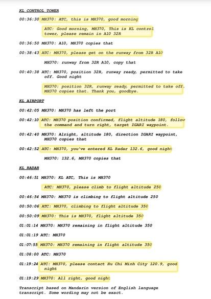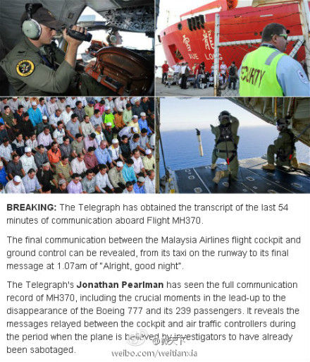 【英媒称掌握失联航班54分钟驾驶舱完整记录】英国每日电讯报宣称,他们掌握了来自马航失联航班驾驶舱的54分钟完整通讯记录。这54分钟的记录是失联航班与地面控制中心的最后通话记录。从飞机起飞开始,最后记录的时间点是北京时间8日凌晨1:07。机上人员当时说:“好的,晚安。”记录全文如下图: