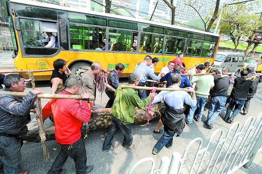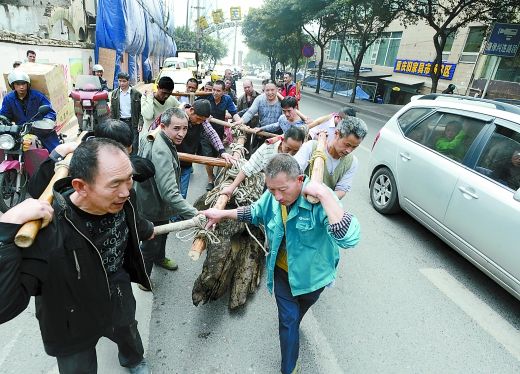 力哥们抬着乌木穿行于车流中。