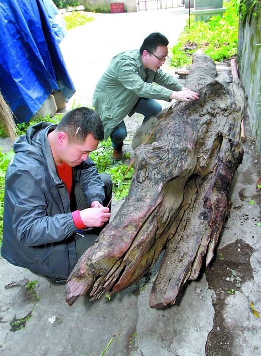 渝中区文管所,工作人员对这根乌木进行测量。