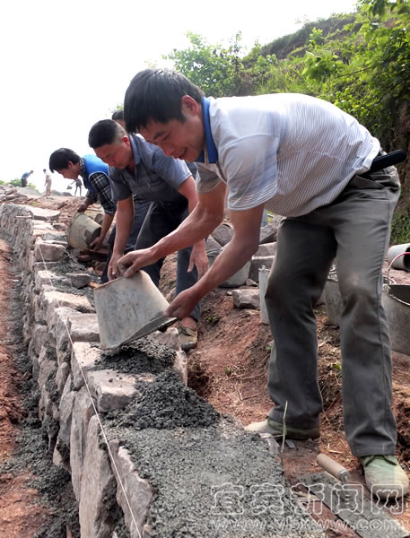 珙县仁义乡新街村村民正在给加宽的组道砌堡坎。李元元 摄