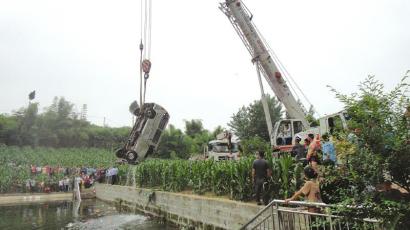 23日下午5:05,华西城市读本记者赶到事发现场时,堰塘里的水大约有 5 米深,吊车还在尝试着将水里的面包车吊起,堰塘里漂浮着不少纸箱,四周站满了围观群众。