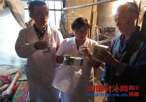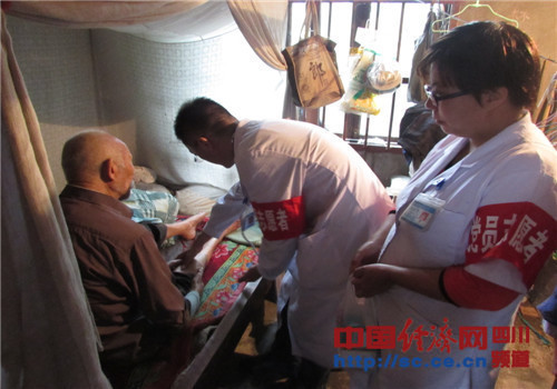 中国经济网泸州9月29日讯(方玲 初旭)9月27、28日是党员义工活动日。27日上午,由副主任医师、内儿外科主任和主管药师组成的党员志愿者专家义诊队伍,在党员领导张云海的带领和石洞镇桥头村干部的陪同下,深入到桥头村4队困难群众何炳生家中进行诊疗和慰问。何炳生老人91岁,双眼失明多年,下肢骨关节病变不能行走,家庭经济十分困难。看到老人躺在破旧的床上,生活的窘迫和疾病的折磨使老人和其家人非常痛苦,志愿者们心情十分沉重。副院长张云海亲自来到老人床前,为老人仔细检查身体,为老人按摩双下肢,送上治疗药品,主管药师刘兴莲向其家人详细讲解服用方法,张院长还仔细讲解了健康和护理知识,帮助老人及其家人树立生活的希望和信心,让他们感受到了党和政府的温暖。在家就享受到了专家级的医疗服务,何炳生老人及其家人十分感动。