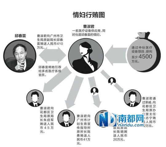 摘要:上周三,广州市卫生局原副局长邱春雷涉嫌受贿415万元一案在广州市中级人民法院开庭。检方指控邱春雷的受贿款中,有410万元是来自其当医疗设备供应商的情妇曹淑君。曹淑君行贿案近日也在广州中院二审,其一审被荔湾区法院认定行贿多人共计528万元,判处有期徒刑十年六个月。