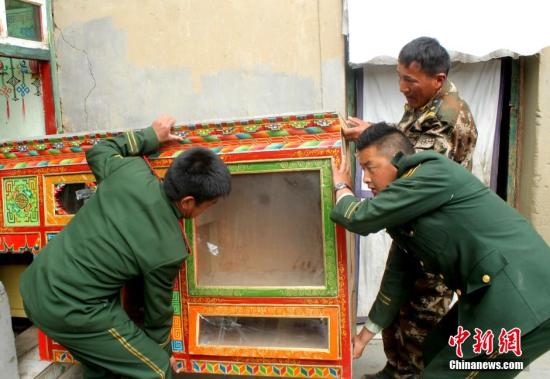 4月25日,武警西藏吉隆边防大队官兵帮助群众转移财产。根据中国地震台网消息,4月25日14时11分在尼泊尔(北纬28.2度,东经84.7度)发生8.1级地震,震源深度20千米。 中新社发朱自文摄