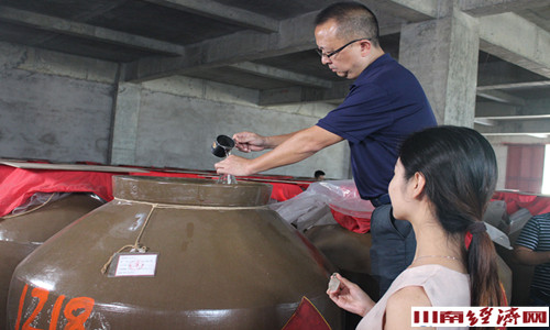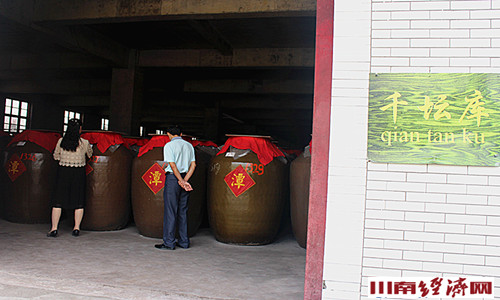 方总一行首先来到酿酒车间,工人正在下窖、上甑,一片忙碌,专家们不时捧起飘香的酒糟讨论着什么。来到酒厂最高处,俯瞰整个厂区,白墙青瓦,红色的办公楼无疑成为一道道亮丽地厂区风景。大小车间错落有致,那排排酒罐,就像那整装待发的士兵,正等待着消费者的检阅。来到仙潭酒厂千坛库。入得库来,酱酒弥香,在坛中珍藏三年的仙潭原浆,在静静等待开启。镁光灯下,十多位专家寻着编号,两人开启一坛取出原酒,静候三年的原酒等来了双标注年份酒的第一步。三年不成酱,三年,一千多个日日夜夜,潭酒用时间蕴酿着自已的故事,也酝酿着潭人的未来和希望。