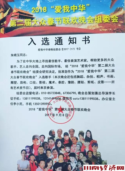 川南经济网讯(李永祥.牛雨晨) 为了在中华大地上寻找最佳歌手、最佳表演艺术家,帮助更多的大众歌手、艺人走向全国,走向国际市场,由国家发展和改革委员会中国经贸导刊杂志社、《成功之路》栏目、爱心中国杂志社、华人时代网、《点亮人生》栏目、香港卫视旅游台《当代华人传奇》栏目、当代华人传奇影视传媒制作(北京)中心联合举办的“2018‘爱我中华’第二届大众春节联欢晚会”报名评审工作已在全国拉开帷幕,四川“白兰花太极变脸”全国巡演者朱晓玉榜上有名。