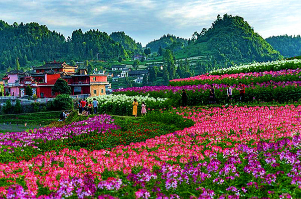 受金榜村的启发,住在仙草湖边的夏松绪、李振斌、夏联富等村民也想打造花海,美化联盟村旅游环境。他们找到李修会,她就及时给受益村民开会,给几个领头人出点子,栽种格桑花和荷花,领着他们干,自己也出资,并指导餐饮服务提档升级。摩尼金榜花海和仙草湖的打造,带动了旅游,助推了当地经济。