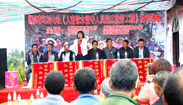 以前摩尼镇街村吃水相当困难。吃的是下家河的水,水根本不够,每隔一天就停一次水。老百姓对此苦不堪言,李修会看在眼里,急在心里,她带领社区的群众到处去找水源,走了很多地方,终于发现在金榜村的猴洞山上有两个泉水。找到水源,又把水拿去检测,找水利局,找政府。2018年开始修水池安管道,每一步,李修会都亲自到场。2019年投入使用,终于解决了摩尼镇上一万多人的饮用水问题。