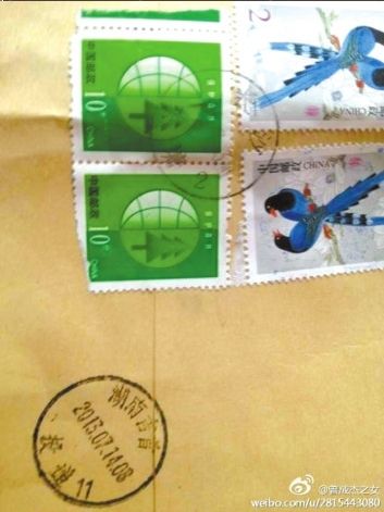 邮戳显示,信件到达吉首时间是14日,发件时间依稀是13日。(据曾成杰之女微博 来源:京华时报)