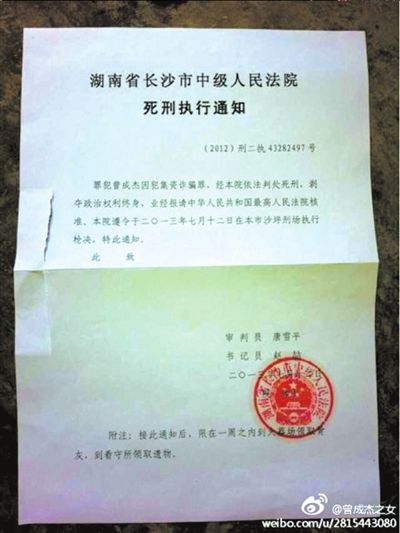 曾成杰的女儿曾珊表示,昨天她收到了来自长沙中级人民法院的死刑执行通知的挂号信。这份标注日期为7月12日的通知内容为:罪犯曾成杰因犯集资诈骗罪,经本院依法判处死刑,剥夺政治权利终身,业经报请中华人民共和国最高人民法院核准。本院遵令于2013年7月12日在本市沙坪刑场执行枪决,特此通知。通知还附注:接此通知的一周内到火葬场领取骨灰,到看守所领取遗物。