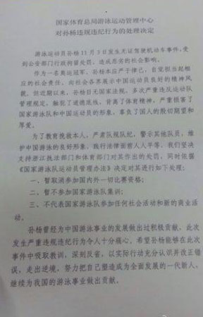 北京时间11月6日,国家体育总局游泳运动管理中心召开新闻委员会通气会,通报了对孙杨的处分决定,国家游泳中心作出对孙杨违规违纪行为的处理决定:暂取消参加国内外一切比赛资格;暂不参加国家队集训;不代表国家队参加任何社会行动和新的商业活动。游泳中心坚决支持浙江执法部门和体育等部门对其作出的处罚。