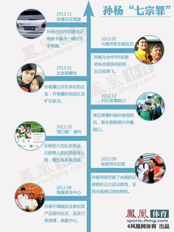 11月3日,在杭州一辆保时捷卡宴与公交车发生刮擦,围观群众发现卡宴驾驶员竟是孙杨。据交警部门查实,孙杨系无证驾驶。4日下午,孙杨被杭州市公安交警部门罚款,并处行政拘留7天。随后浙江体育职业技术学院对外发布了对孙杨在全运会后多次违纪行为的处罚决定。孙杨被处以停训、停赛、停止一切商业活动,以及建议暂不参加国家队集训的严厉处罚。