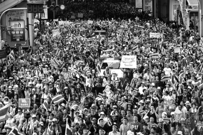 黄衫军有“占领”的传统。2006年,黄衫军曾凭借大规模集会和占领主要街道等活动直接触发军事政变,2008年曾占领总理府和曼谷两座机场。“黄派”这次卷土重来,在一些分析师看来,有可能会引发新一轮的社会动荡。仅24日一天,民主党号称集会人数达到18万。