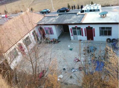 站在高处俯视这户人家,南北西三面均有房间。爆炸发生在南面一侧的房子里,爆炸发生后,这间房的门窗被冲击波推到了院子的北侧。昨晚6时,院内依然放着两具遗体,分别用红色和蓝色塑料布掩盖着。