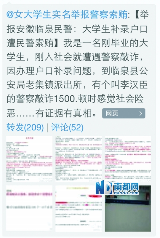 在微博上举报此事的是一位网名叫“女大学生实名举报警察索贿”的网友。这位简介显示所在地为北京东城的网友前晚发表图文微博称,自己大学刚毕业,“刚入社会就遭遇警察敲诈,因办理户口补录问题,到临泉县公安局老集镇派出所,有个名叫李汉臣的警察敲诈1500(元),顿时感觉社会险恶”。