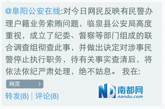 前日,一位自称大学刚毕业的网友,在微博上发帖举报,日前其在安徽阜阳市临泉县公安局老集镇派出所办理户口补录时,遭遇该所一位民警索贿。对此,阜阳市公安局昨晚回应,临泉县公安局已成立多部门联合调查组,并已对涉事民警先停职,待有关事实查清后,将依法依纪严肃处理。