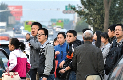 没能挤上去的乘客,满目怅然地看着车子朝北京方向开去,焦急地等待下一辆公交车的到来。