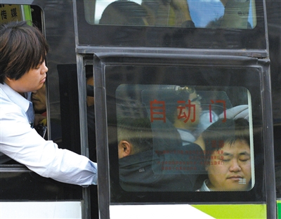 车门没能顺利关上。售票员从车窗探出身子,伸手将卡在门口的乘客往车里推了几把,这才使车门顺利关严。
