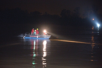 20日,法国南部城市波尔多附近的吕贡,救援人员乘小艇在多尔多涅河上进行搜救。