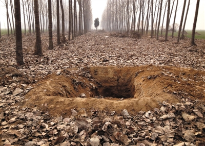 12月19日,半坡店村东的杨树林里,村民说,警方曾从这个坑里挖出一具尸体。