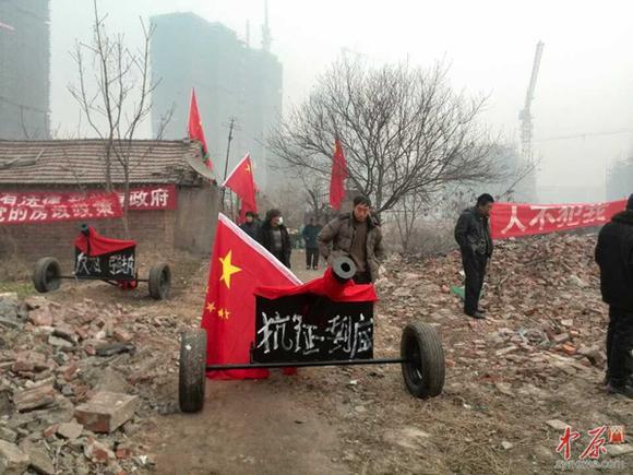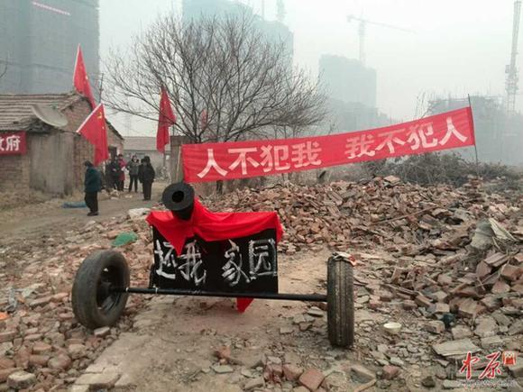 据制做“红衣大炮”的周建帮师傅讲,他们所住的地方,为河南省建材厂家属院,2011年建材厂与上海农工商房地产公司签订了协议,要将这里进行拆迁改造。 周师傅说,从2013年7月16日开始,就不断有人过来,称要拆迁,他家的房屋按200元一平进行赔偿,他不同意,就开始有人不停的骚扰他们,把电停了,自己做煤球的机器不能运转。随后的日子里,经常有人晚上推他家的围墙,扔砖头和砸玻璃,周围其他的居民也是经常被骚扰。前几天,他买了些管子,按照大炮的样子,焊接做了6门“大炮”。