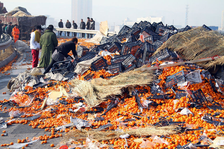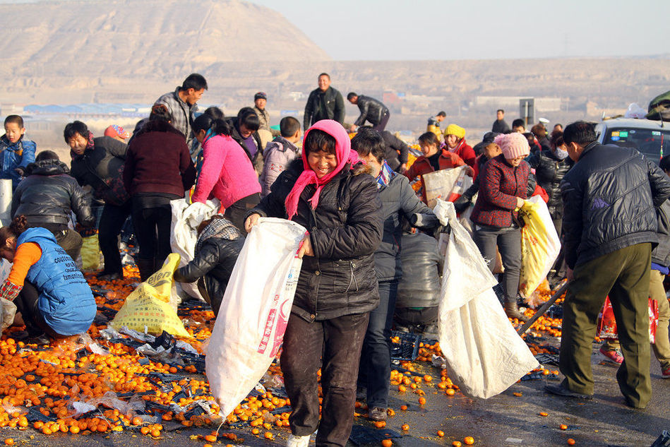 1月4日,兰州, 一辆满载橘子的大货车不幸发生侧翻,一车橘子几乎全部散落在路上以及匝道下方的农田里,近百余村民提着各种袋子在路边哄抢橘子,场面一度失控。