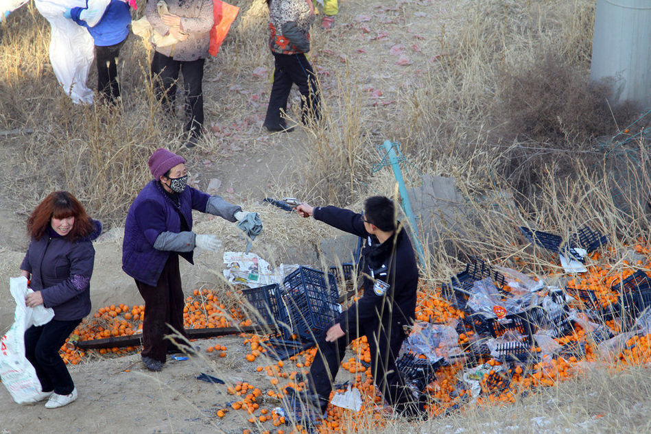 村民提着各种袋子在路边哄抢橘子,场面一度失控